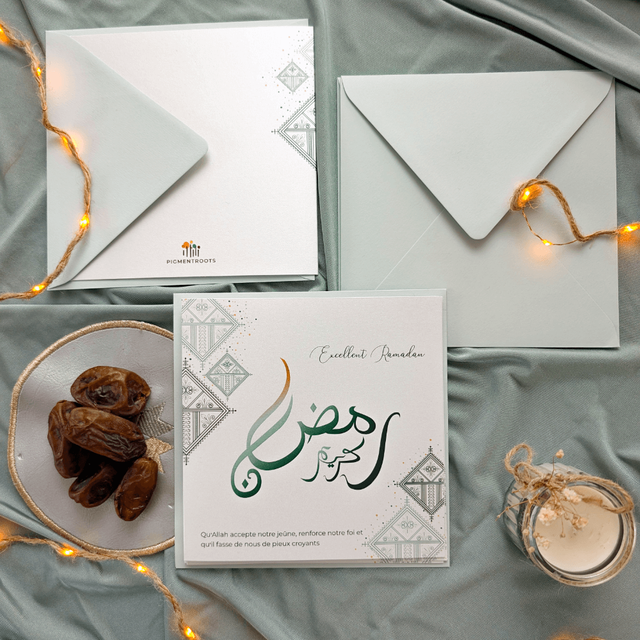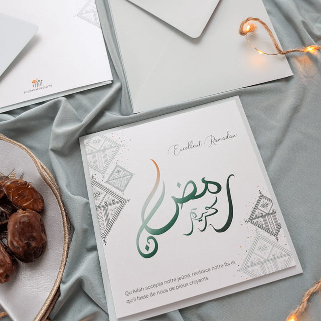Le terme « Ramadan Karim », inscrit en arabe sur la carte, est une formule qui souhaite un mois de Ramadan riche en bénédictions, en générosité et en spiritualité.